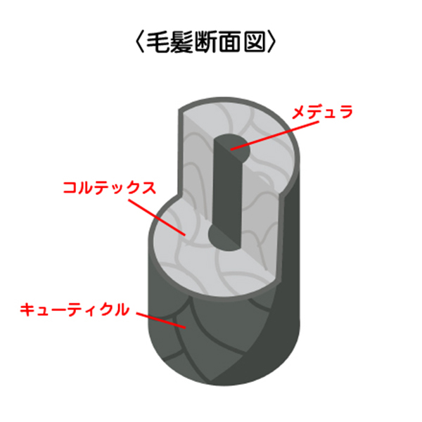 髪のツヤ感や手触りに大きく関わっており、キューティクルが剥がれたり傷んだりすると
