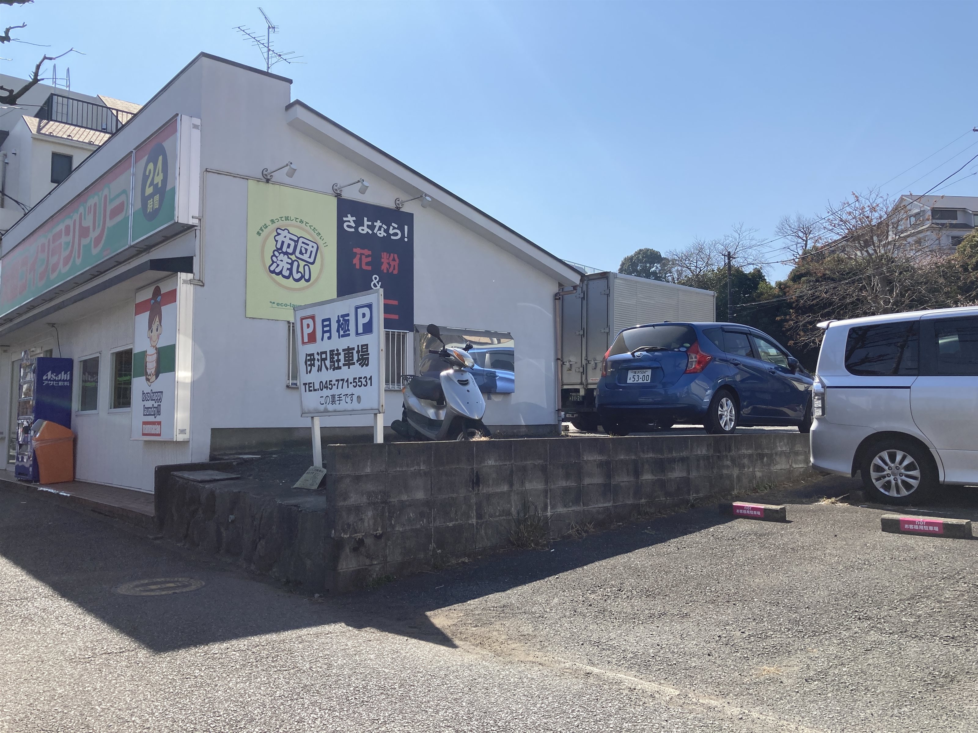 お店から徒歩30秒、笹下釜利谷街道沿いにお店と同じ道路側の場所にございます。